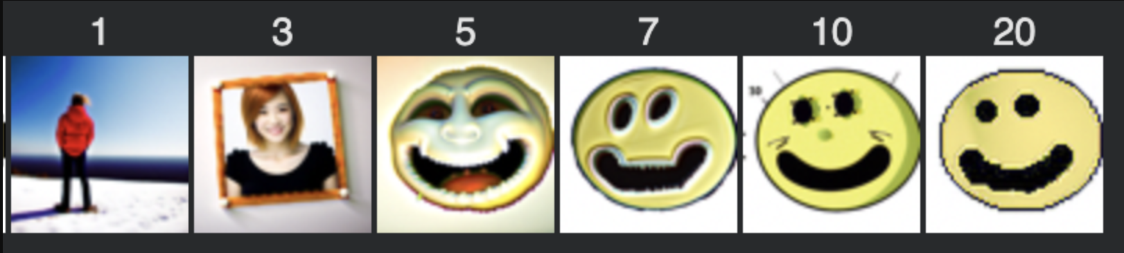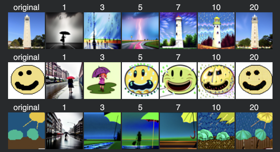 Here, the prompt was “a rainy day”. Notice now the images gradually have more and more “rain-like” features. For example, the campanile turns into a bolt of lightning for time step 5 of the first row. Similarly, the happy face drawing starts to show small droplets of rain on its sides.