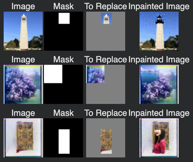 We can use a mask to keep parts of the image constant while denoising the rest. At each step of the backward process, we force the pixels outside the mask to match the noisy version of the original image, while letting the model hallucinate content inside the mask.