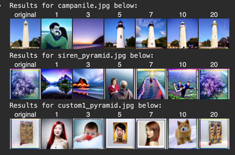 Below I show edits of the Campanile image at noise levels [1, 3, 5, 7, 10, 20] with the conditional text prompt “a high quality photo”. I also show two edits of my own test images, which are captioned “original” in the below image: