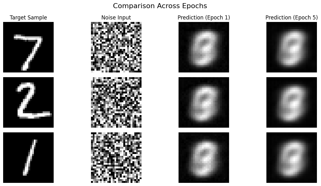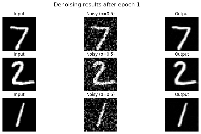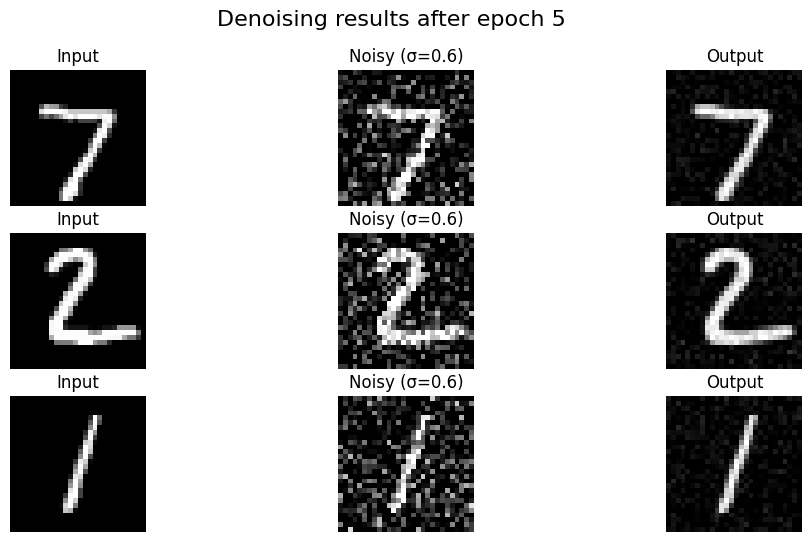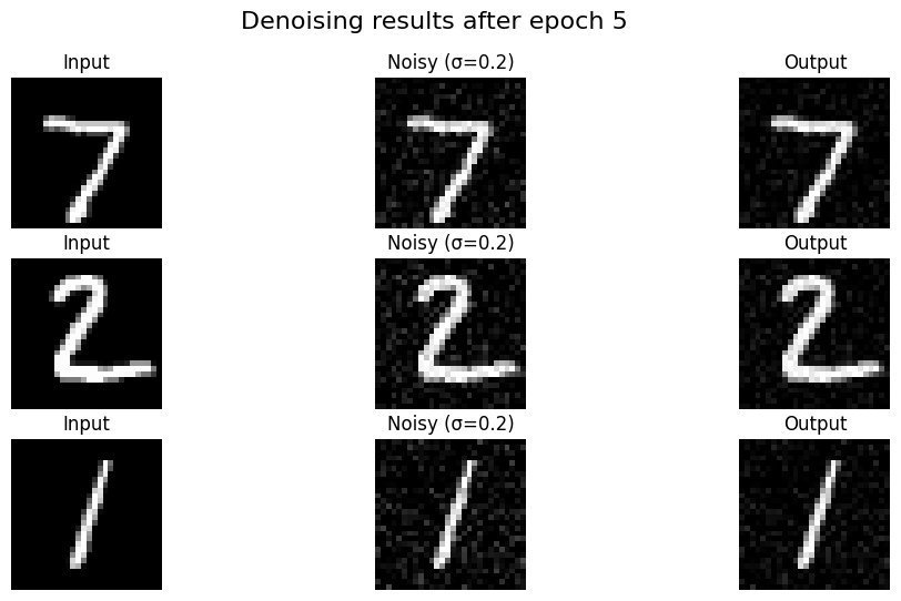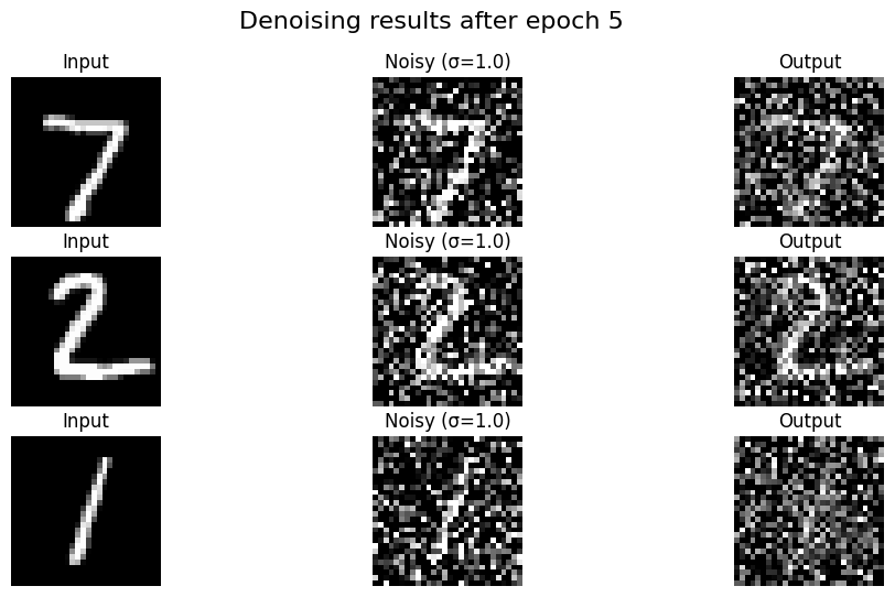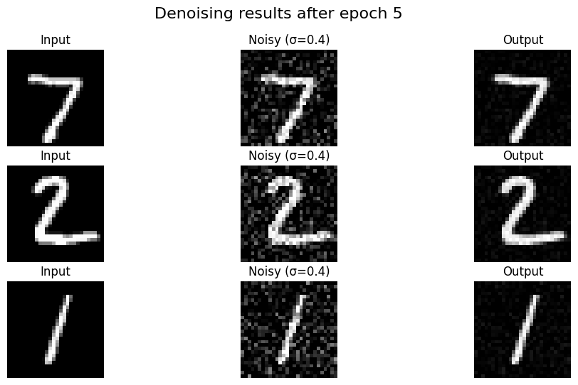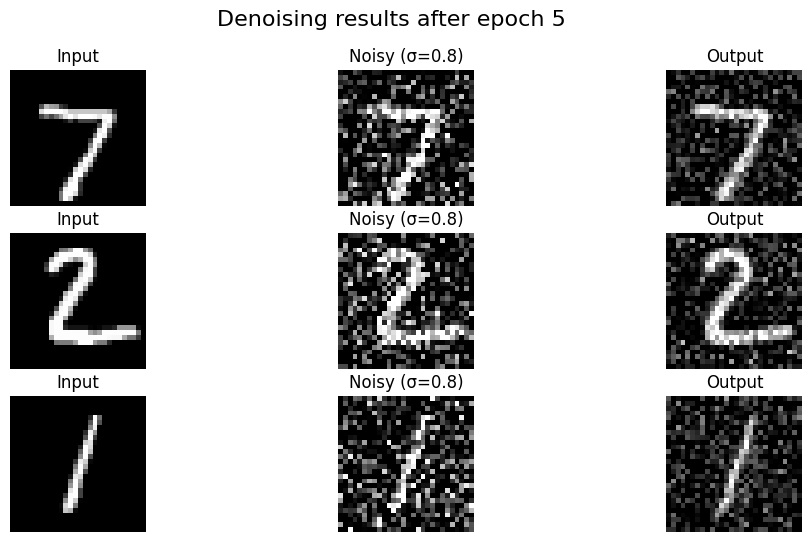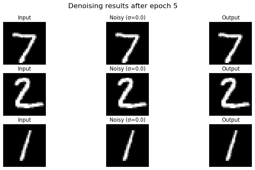 Denoising Results (Epoch 1 vs Epoch 5): The model learns to remove the noise effectively after just a few epochs.