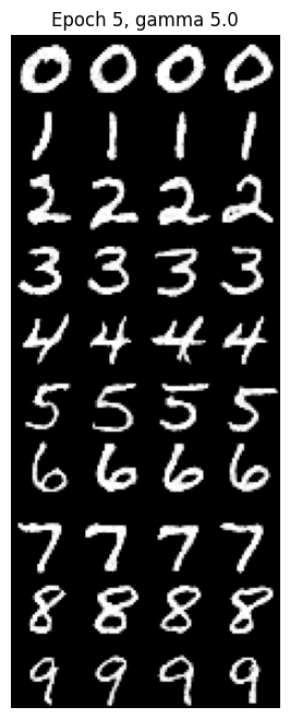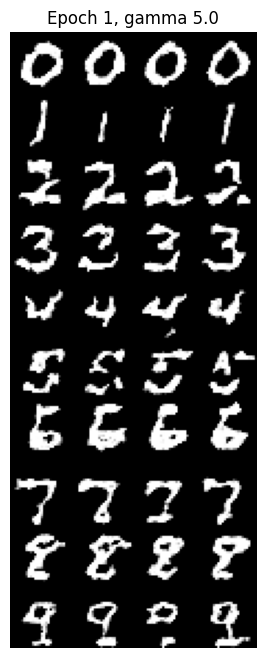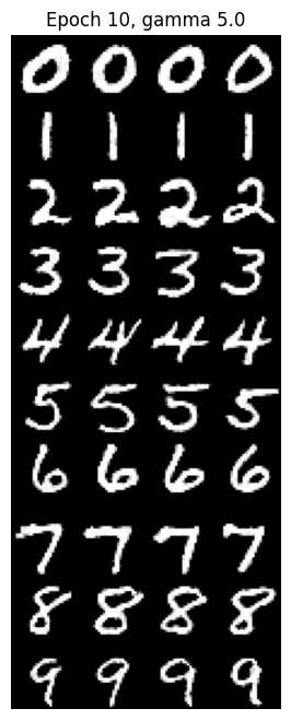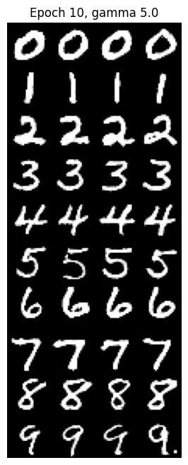 By guiding the model with class labels, we can generate specific digits. Here are the results over 10 epochs using Classifier-Free Guidance ($\gamma=5.0$).